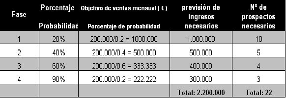 Los ingresos previstos necesarios en cada fase para poder obtener unas ventas mensuales de 200.000 € suponen dos pasos a seguir. En el primer paso consiste en dividir los ingresos previstos por el porcentaje de probabilidad de cada fase con lo cual se consigue el total de ingresos que necesitaría esa fase. El segundo paso consiste en redondear hacia arriba los ingresos hasta la cantidad mas cercana que sea numero entero de 100.000 €. El calculo de los ingresos necesarios en la fase 4 es de 222.000 € este valor se redondeo a 300.000 € que serían la previsión de ingresos necesarios en la fase 4. Para computar el numero de prospectos necesarios en cada fase se dividen los ingresos previstos en cada fase entre el promedio de venta por prospecto. Para este ejemplo, el numero de prospectos necesarios en la fase 4 es de tres, se ha obtenido de dividir 300.000 € entre 100.000 €.
